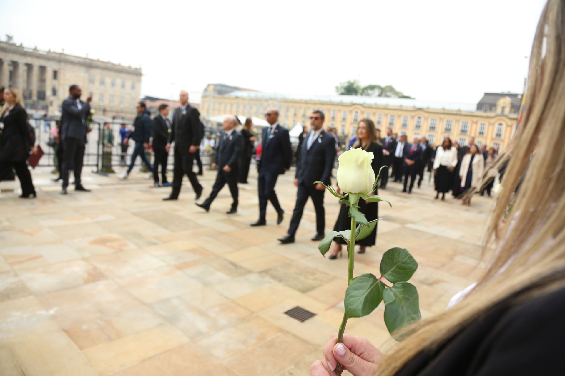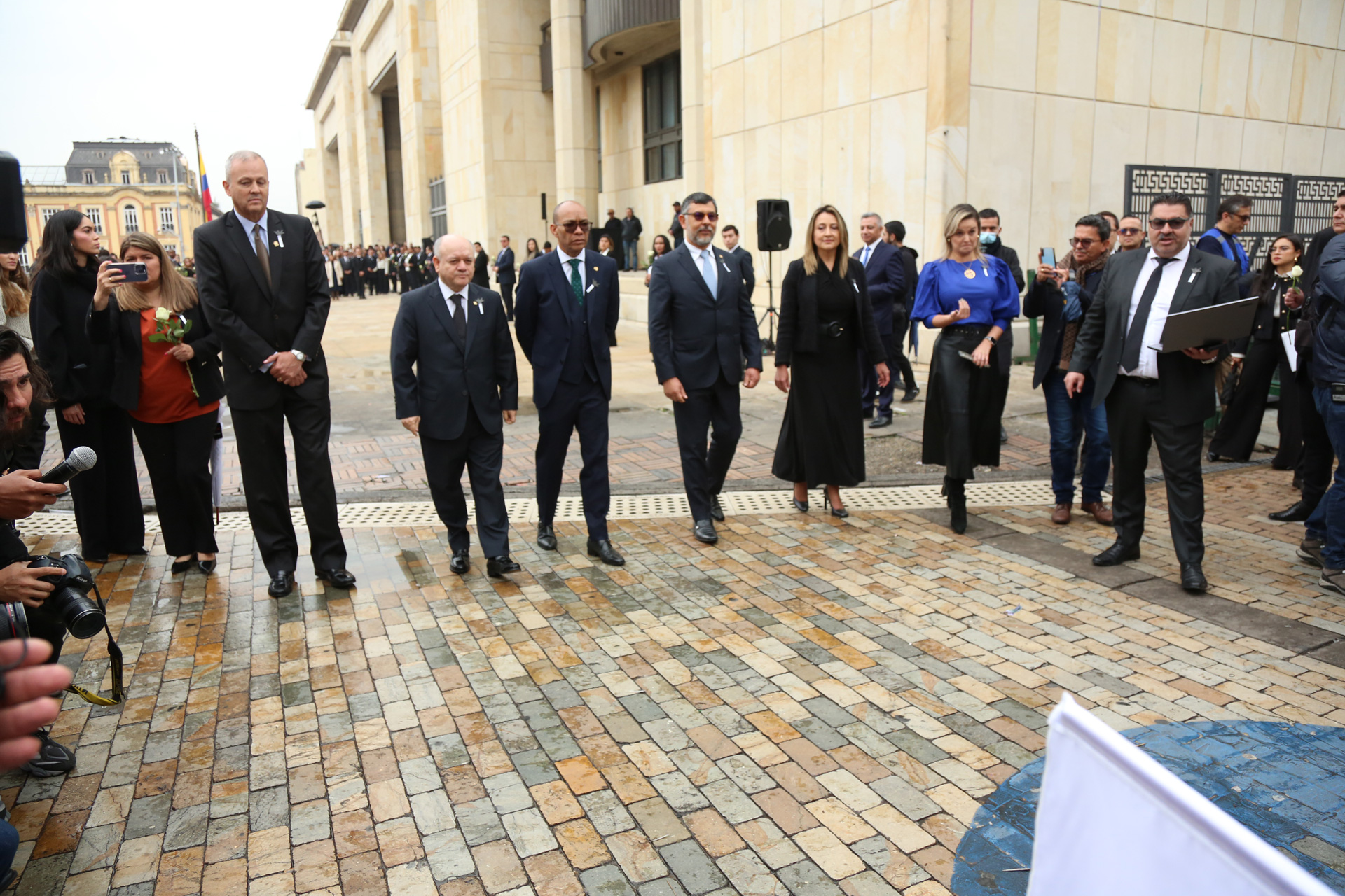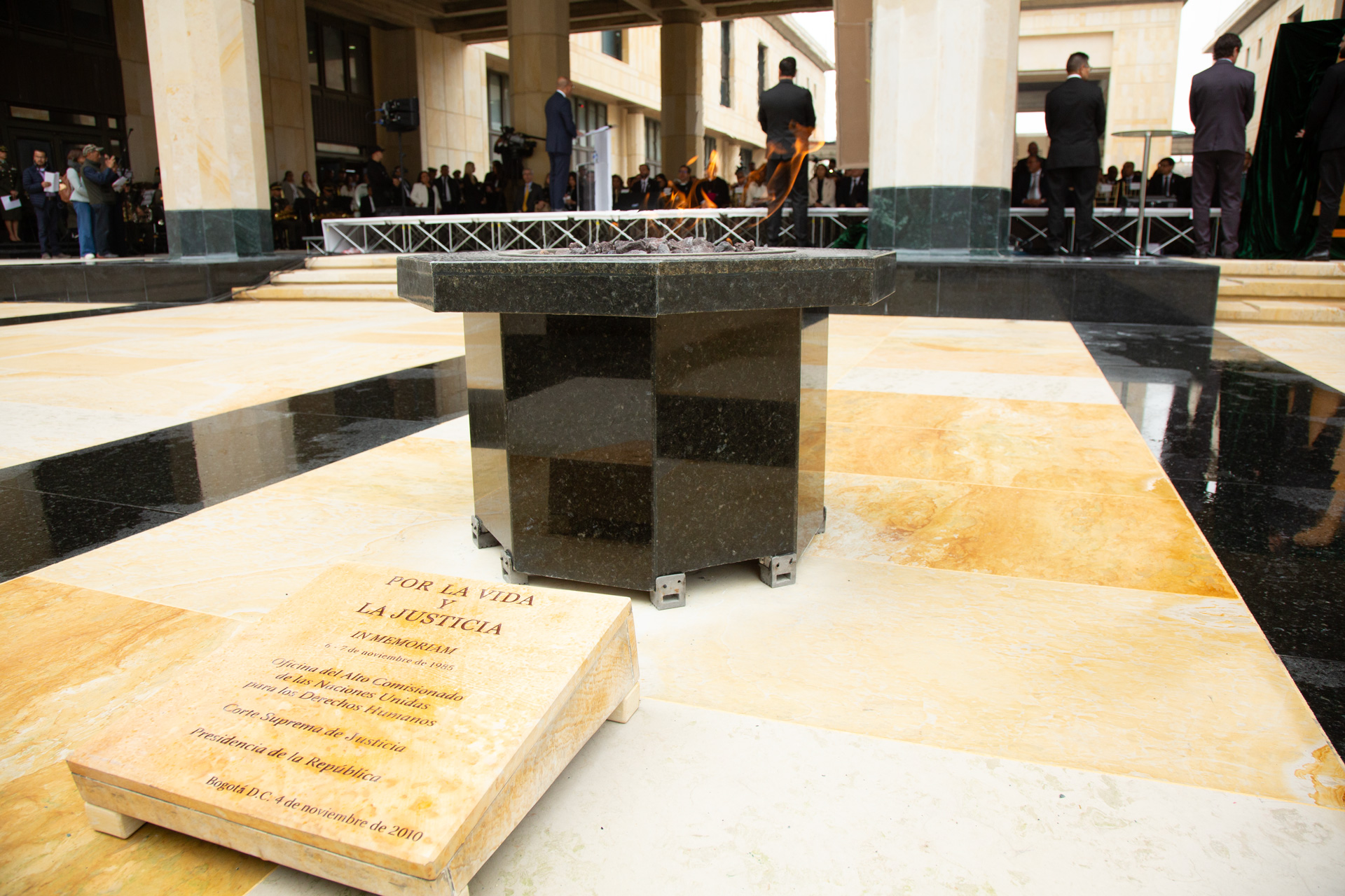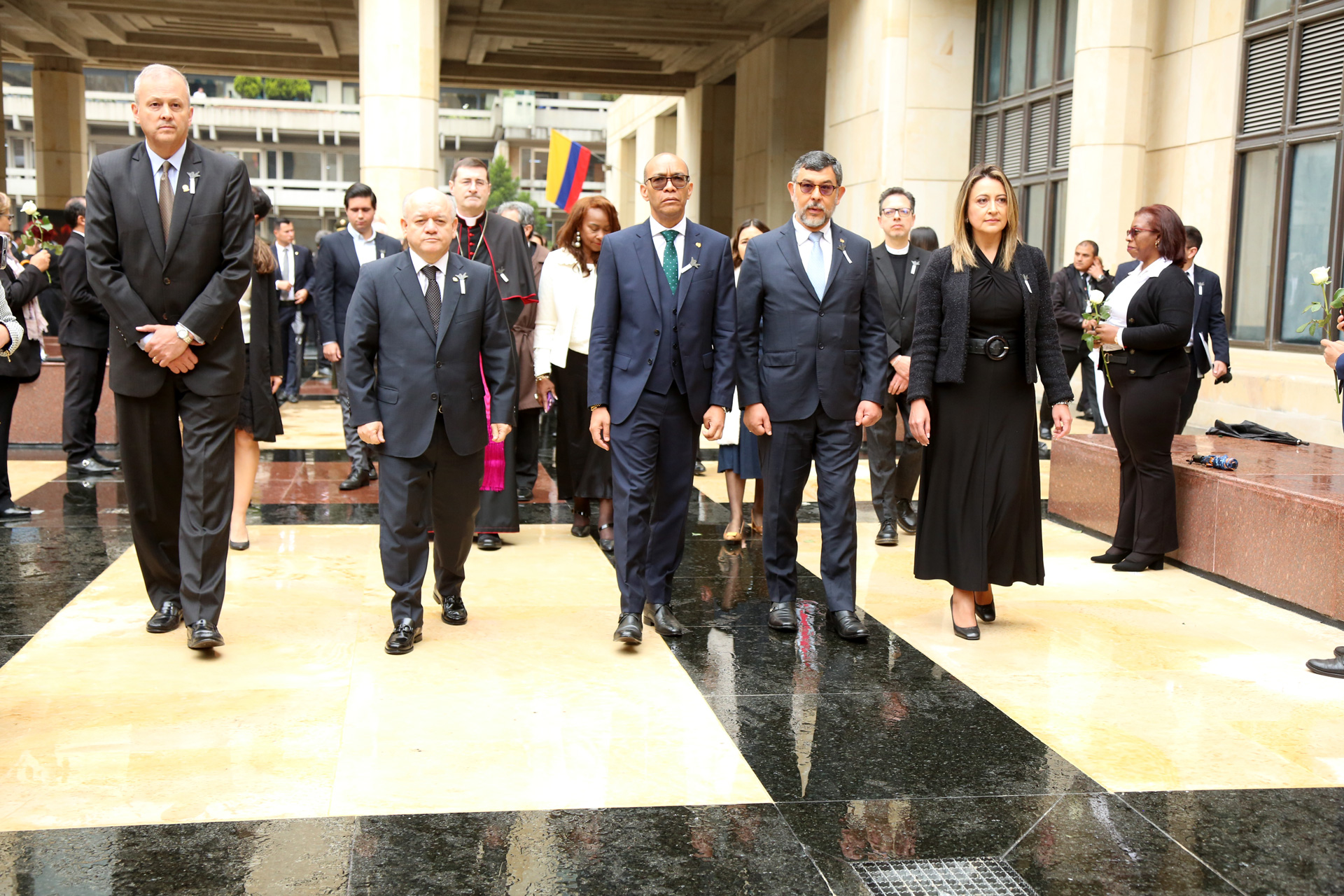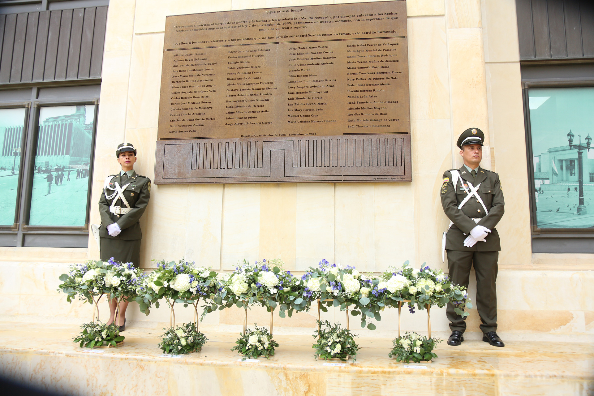 Presidentes de las altas cortes realizaron una solemne ofrenda floral que fue puesta en la placa “Que cese el fuego”, un monumento simbólico que honra la memoria de las víctimas del trágico asalto al edificio ocurrido el 6 y 7 de noviembre de 1985