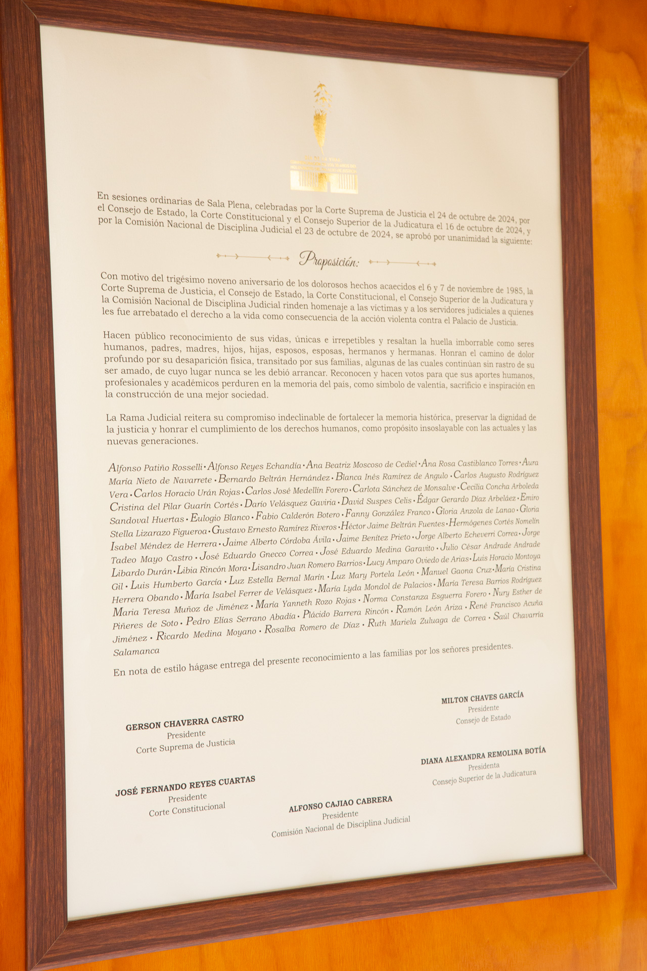 Este pergamino fue firmado por los cinco presidentes de las Altas Cortes y una réplica del mismo fue entregada a las familias presentes, como símbolo de gratitud y en memoria de los seres queridos que se honraron.