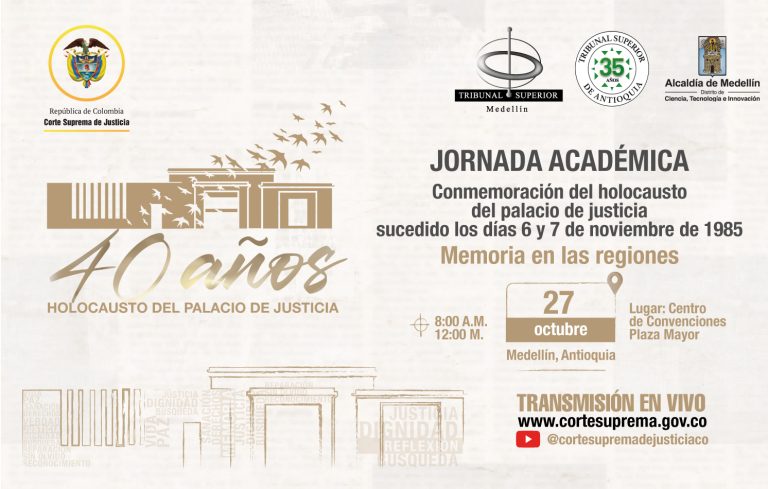 Bogotá D. C., jueves 23 de octubre de 2025. El próximo lunes 27 de octubre, el presidente de la Corte Suprema de Justicia, Octavio Augusto Tejeiro Duque, estará en Medellín para participar en un acto académico y una ceremonia solemne en conmemoración de los 40 años del Holocausto del Palacio de Justicia.