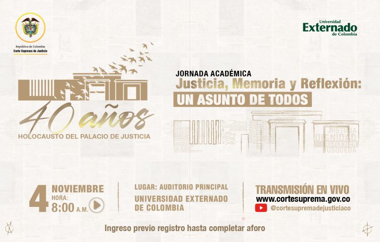 Bogotá D. C., miércoles 29 de octubre de 2025. En el marco de la conmemoración de los 40 años del holocausto del Palacio de Justicia, la Corte Suprema de Justicia realizará, con el apoyo de la Universidad Externado de Colombia, la jornada académica “Justicia, memoria y reflexión: un asunto de todos”