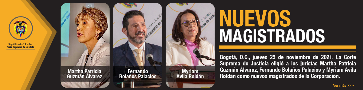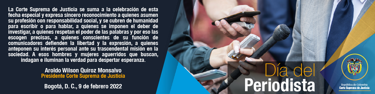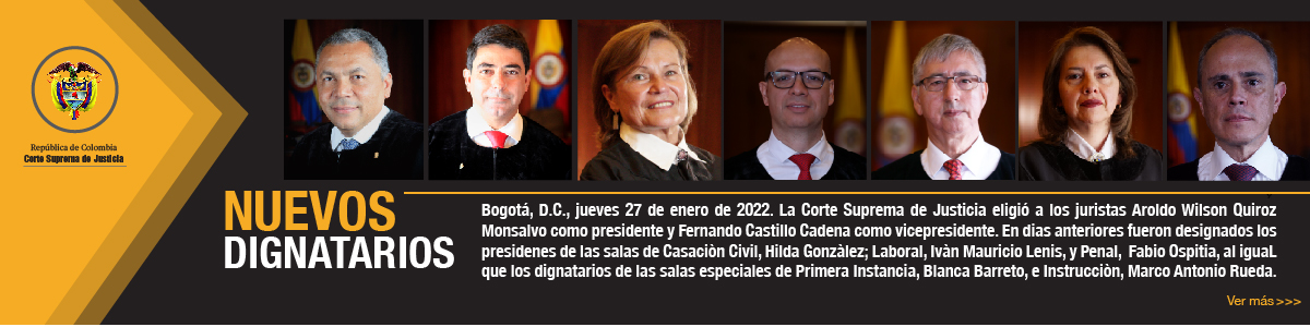 Noticias de la Corte Suprema de Justicia Noticias 10 febrero, 2022 Corte recuerda las circunstancias que se deben evaluar para reconocer la ira en un homicidio 10 febrero, 2022 Leer más Noticias 9 febrero, 2022 Corte absuelve a exgobernador del Chocó al determinar que no actuó con dolo cuando reconoció pensión a un docente 9 febrero, 2022 Leer más Noticias 31 enero, 2022 Corte Suprema de Justicia declara dos días de duelo por fallecimiento del magistrado Jorge Luis Quiroz Alemán 31 enero, 2022 Leer más Noticias 30 enero, 2022 La Corte Suprema de Justicia lamenta el fallecimiento de su magistrado Jorge Luis Quiroz Alemán 30 enero, 2022 Leer más Noticias 27 enero, 2022 Magistrado Aroldo Wilson Quiroz Monsalvo, nuevo presidente de la Corte Suprema de Justicia 27 enero, 2022 Leer más Noticias 15 diciembre, 2021 Desmovilizados que se acogieron a Justicia y Paz sí deben ser judicializados por delitos contra integrantes de fuerza pública, sin posibilidad de amnistía 15 diciembre, 2021 Leer más Conozca las actividades de la Corte Suprema de Justicia registradas en los principales medios de comunicación de Colombia y el mundo XXIII Encuentro de la Jurisdicción Ordinaria. Justicia, virtualidad e independencia. Audiencias públicas de la Corte Suprema de Justicia Twittear