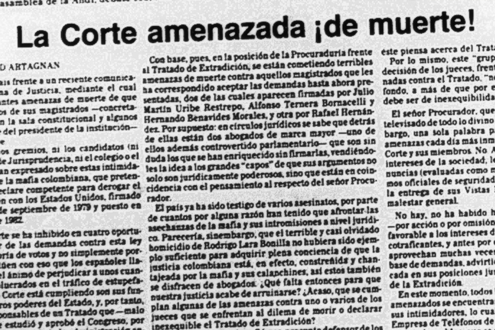 • El 20 de octubre de 1985, en una página editorial del diario El Tiempo de Bogotá, el columnista D´artagnan (seudónimo) tituló: “La Corte amenazada ¡de muerte!”. Allí denunció las amenazas que habían recibido los magistrados de la Sala Constitucional y algunos de la Sala Penal por parte de grupos delincuenciales dedicados al narcotráfico, que pretendían derogar el Tratado de Extradición firmado con los Estados Unidos.