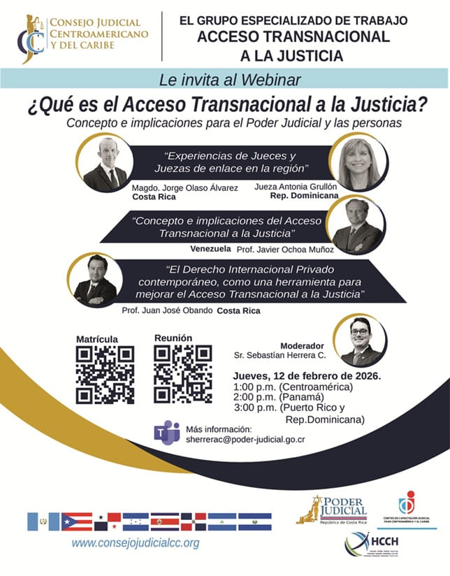 En esta oportunidad les extendemos, de parte de la Presidencia Pro Témpore del Consejo Judicial Centroamericano y del Caribe y del Magistrado Luis Guillermo Rivas Loáiciga, en su calidad de Coordinador Nacional, la invitación a participar en el webinar organizado por el Grupo Especializado de Trabajo de Acceso Transnacional a la Justicia, titulado: