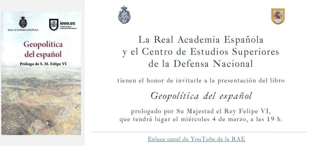 Invitación para seguir en directo, a través de su canal oficial de YouTube, la presentación del libro Geopolítica del español, que tendrá lugar hoy 4 de marzo, a las 19:00 hs (Madrid, España).