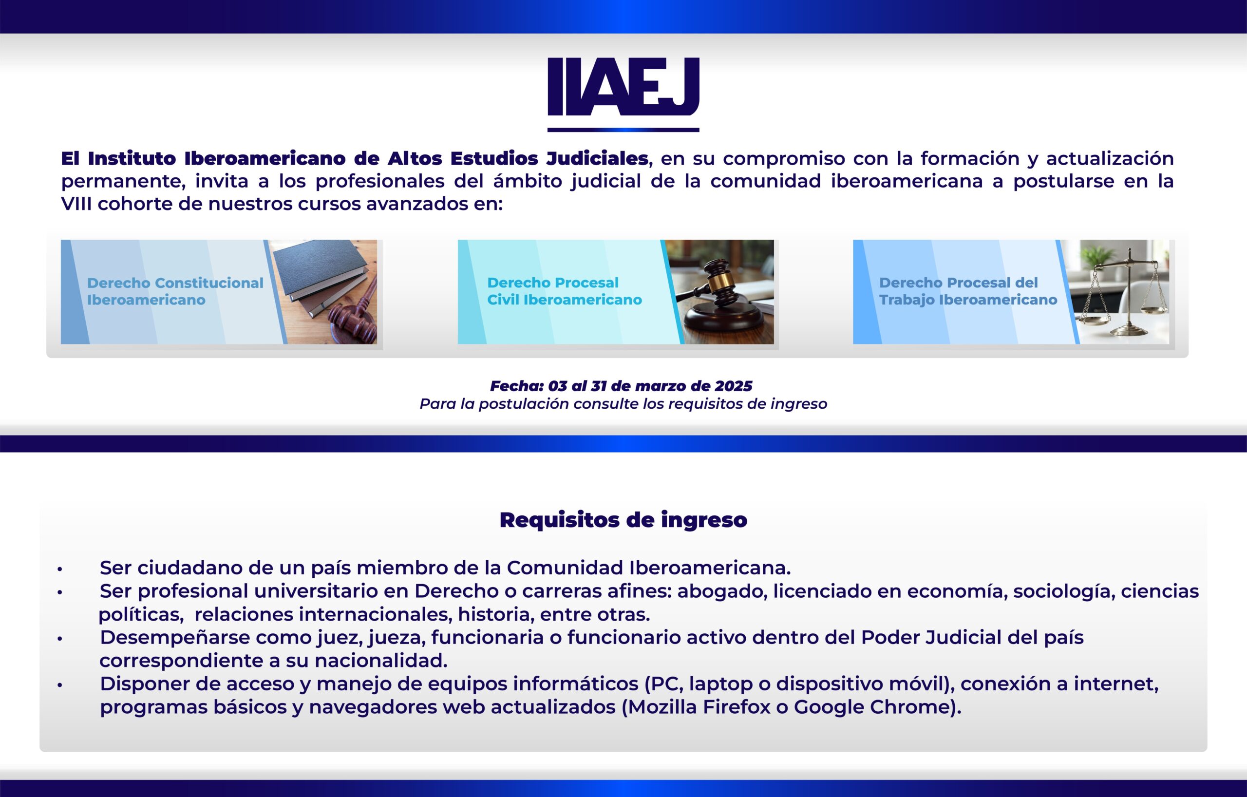 Junto con saludarles, y por especial encargo del Instituto Iberoamericano de Altos Estudios Judiciales (IIAEJ), les extendemos la presente comunicación a efectos de difundir la convocatoria correspondiente al período 2026-I.