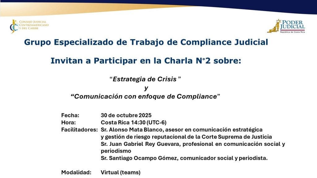 Nos complace extenderles, en nombre del Poder Judicial de Costa Rica, una atenta invitación para participar, en modalidad virtual (Microsoft Teams), en la Charla N.º 2 sobre “Estrategia de Crisis” y “Comunicación con enfoque de Compliance”, la cual se llevará a cabo el 30 de octubre de 2025, a partir de las 2:30 p.m. (hora de Costa Rica).