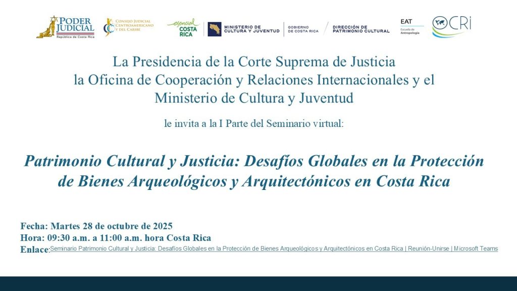 Nos complace extenderles, en nombre del Poder Judicial de Costa Rica, una atenta invitación para participar, en modalidad virtual, en la “I Parte del Seminario Virtual: Patrimonio Cultural y Justicia: Desafíos Globales en la Protección de Bienes Arqueológicos y Arquitectónicos en Costa Rica”, que se llevará a cabo el próximo 28 de octubre de 2025, a partir de las 9:30 a.m. (hora de Costa Rica).