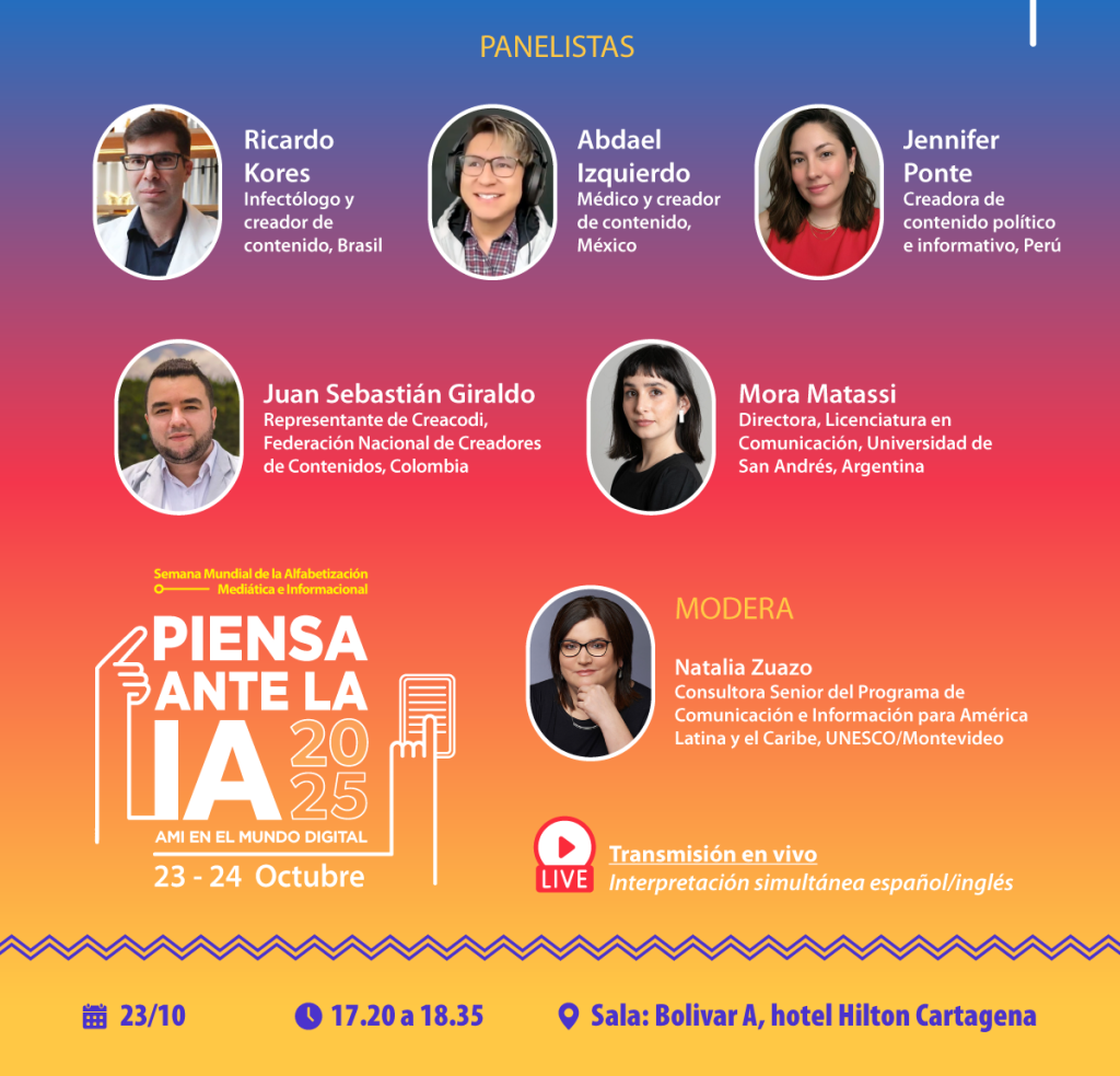 La Oficina Regional de la UNESCO en Montevideo tiene el gusto de invitarles al panel “Influencia en el Espacio Digital: Creación de Contenido y Dinámicas de Información en América Latina”, en el marco de la Semana Mundial de la Alfabetización Mediática e Informacional 2025 – Piensa ante la IA.