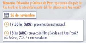 Te invitamos a este encuentro híbrido organizado en conjunto por el Centro Ana Frank y UNESCO . Reflexionaremos sobre los ejes de educación, memoria y cultura de paz, tomando como punto de partida el film ¿Dónde está Ana Frank?, de Ari Folman.