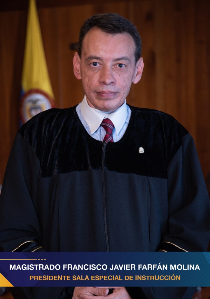 El magistrado Francisco Javier Farfán Molina es abogado egresado de la Universidad de Los Andes, especializado en Ciencias Penales y Criminológicas en la Universidad Externado de Colombia, y en Derechos Fundamentales en la Universidad Complutense de Madrid. Su larga carrera laboral la ha ejercido, de manera mayoritaria, en el sector público, en el ejercicio independiente y en la academia como profesor de Derecho Penal de varias universidades. Fue director de la Escuela Judicial Rodrigo Lara Bonilla; magistrado auxiliar de la Sala Jurisdiccional Disciplinaria del Consejo Superior de la Judicatura; director nacional de Investigaciones Especiales de la Procuraduría General de la Nación; procurador delegado para la Moralidad Pública (E); procurador Primero Delegado para la Casación Penal, y conjuez de la Sala de Casación Penal de la Corte Suprema de Justicia. Ha sido profesor de Derecho Penal General, Derecho Penal Especial y Derecho Disciplinario de las Universidades de Los Andes, Externado de Colombia y Javeriana. Ha publicado 12 libros y 20 artículos en revistas especializadas, sobre temas de derechos fundamentales, derecho procesal penal y actos de investigación, entre los cuales se destacan: Interceptación de comunicaciones telefónicas en el proceso penal y Disciplinario, “El agente encubierto en el proceso penal”, “La masacre de machuca: autoría mediata en aparatos organizados de poder”, “La cadena de custodia en la investigación penal y disciplinaria”, “La prueba ilícita en el proceso penal y disciplinario”, y “El polígrafo y su utilización como acto de investigación en el derecho sancionatorio”