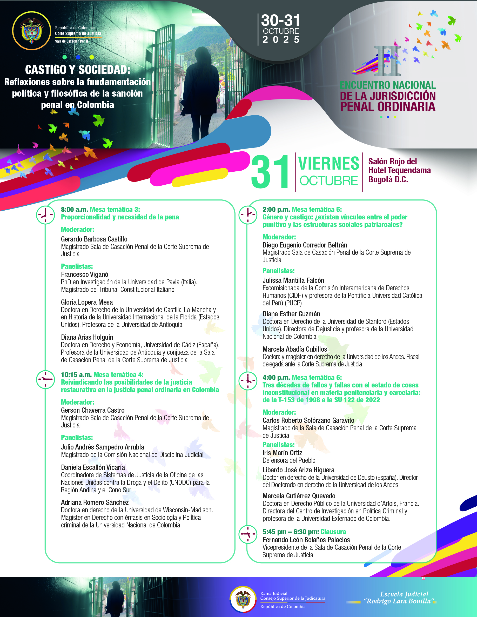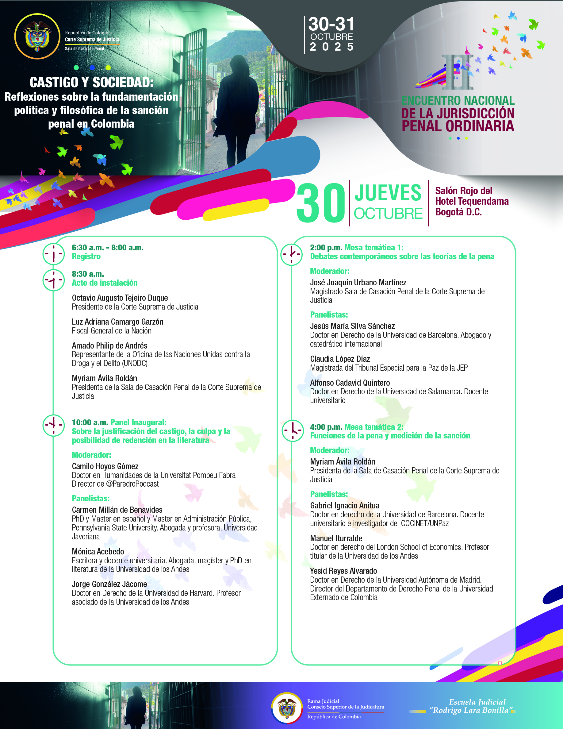 La Sala de Casación Penal de la Corte Suprema de Justicia tiene el gusto de invitar a todas las personas vinculadas a la rama judicial, juezas y jueces, magistradas y magistrados del país; abogados, académicos y a la sociedad en general, al Segundo Encuentro Nacional de la Jurisdicción Penal Ordinaria, «Castigo y Sociedad: reflexiones sobre la fundamentación política y filosófica de la pena», que se realizará, en la ciudad de Bogotá, los próximos jueves 30 y viernes 31 de octubre.