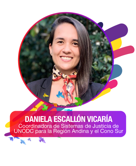 Daniela Escallón Vicaría, es abogada de la Universidad del Rosario, Especialista en Psicología Jurídica y cursa una Maestría de Cooperación Internacional. Se ha desempeñado en temas de justicia restaurativa en la Fundación Internacional Terre des hommes; en la Alcaldía de Medellín; en el Viceministerio de Política Criminal y Justicia Restaurativa; y en la Jurisdicción Especial para la Paz. Actualmente, es Coordinadora de Sistemas de Justicia de la Oficina de las Naciones Unidas contra la Droga y el Delito para la Región Andina y el Cono Sur y docente universitaria.